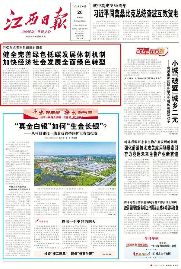 大江网/大江新闻客户端讯 江西日报全媒体记者魏星报道:6月25日,省委书记尹弘深入宜春、南昌,围绕推进绿色低碳发展体制机制改革进行专题调研。他强调,要深入贯彻习近平生态文明思想,以进一步全面深化改革为动力,健全完善绿色低碳发展体制机制,提升产业绿色低碳发展水平,构建碳排放双控制度体系,加快经济社会发展全面绿色转型,让绿色成为江西高质量发展的鲜明底色。